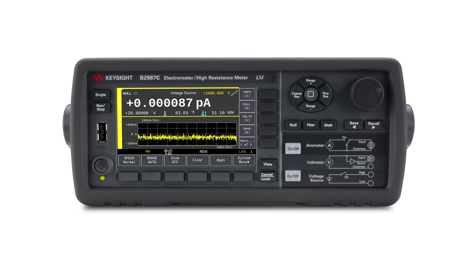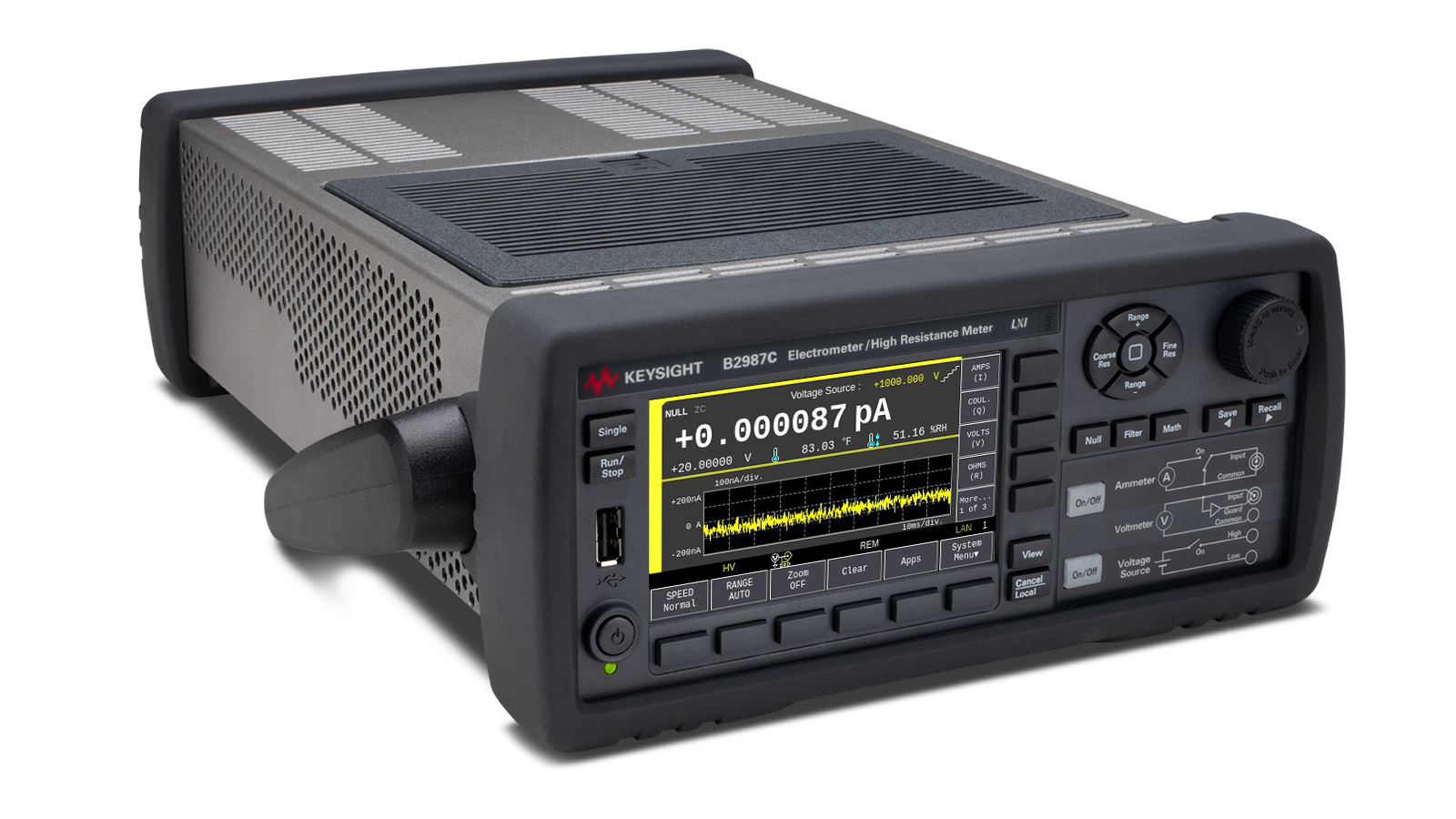 The B2987C is the only graphical electrometer that combines high-sensitivity current measurement with large resistance measurement up to 10 PΩ. Its 4.3” color LCD enables real-time trend analysis and histogram data, enabling quick statistical analysis without a PC. Battery operation eliminates AC noise, ensuring more reliable measurements. The Setup Integrity Checker software helps diagnose noise sources by comparing different cabling and fixturing setups.